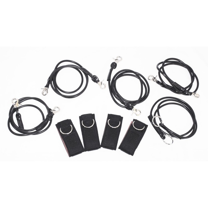 The 9-piece black Bondage Set from You2Toys has 4 restraints, 4 leashes with snap hooks and 1 connection strap. The soft restraints are suitable for hands and/or feet. They can be put on quickly and adjusted to fit, thanks to their hook and loop fasteners. Each restraint has an attachment ring for the leashes. The sturdy leashes have soft surfaces and snap hooks at either end. The connection strap also has a ring at either end.