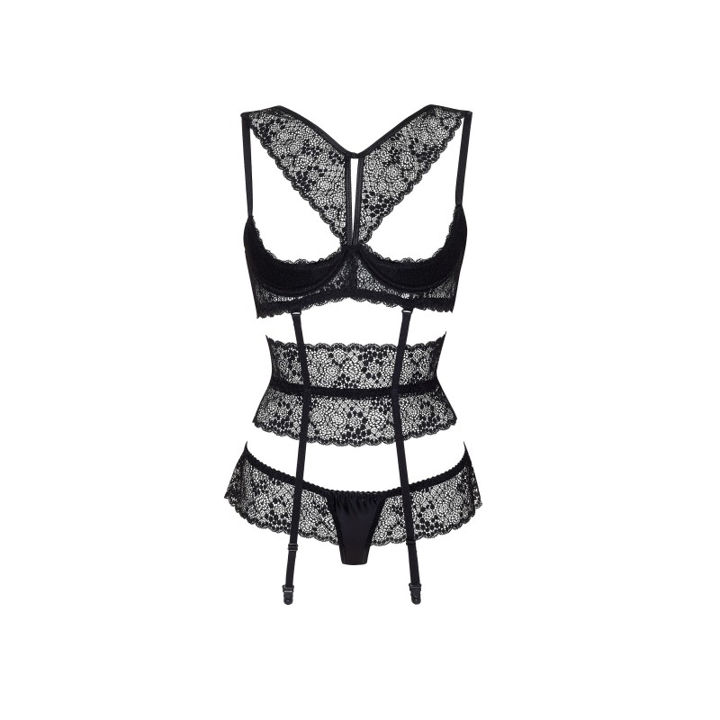Design: Underwired bra that provides support and accentuates your curves, ensuring you feel comfortable and seductive. Luxurious lace adds a touch of sophistication and sensuality. Adjustable straps and hooks on the back. High-waisted garter belt that emphasises your figure and adds a vintage charm. Matching thong that completes the set with a sexy and daring look.