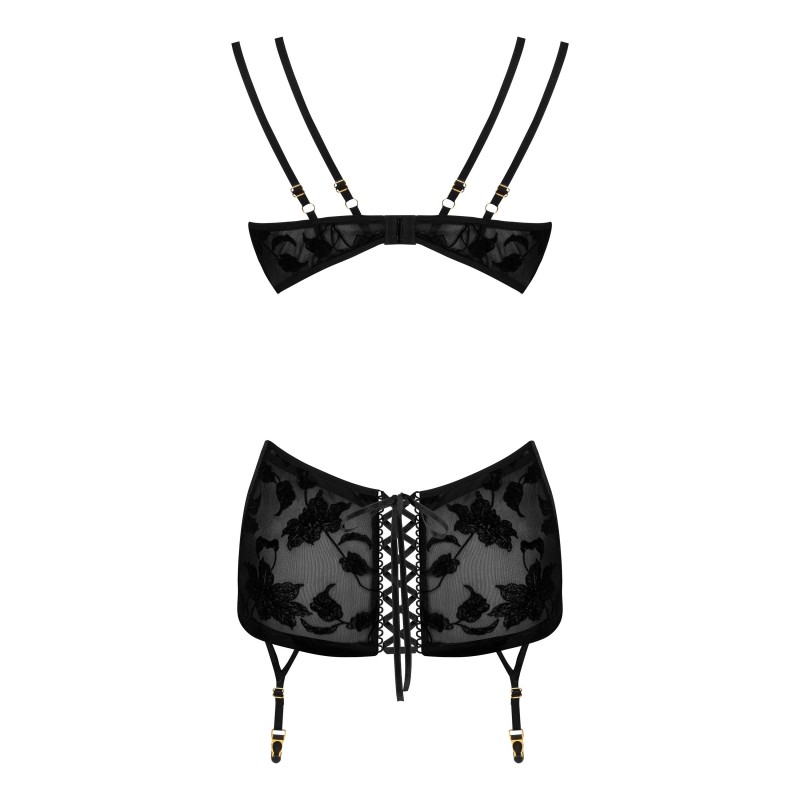 Sensual, black lingerie set made of velvet and tulle with a velvety floral motif.