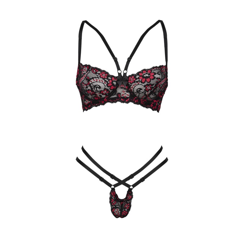 Rosalinda is a lingerie set made of black lace with sparkling red flowers. This set emphasises women's curves, boosting confidence.