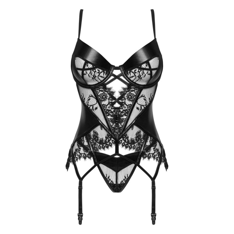 A beautiful, erotic corset from the Leonela series in black. The combination of delicate lace with latex-like material will ignite the desire of many men. This corset is the perfect choice for every demanding customer.