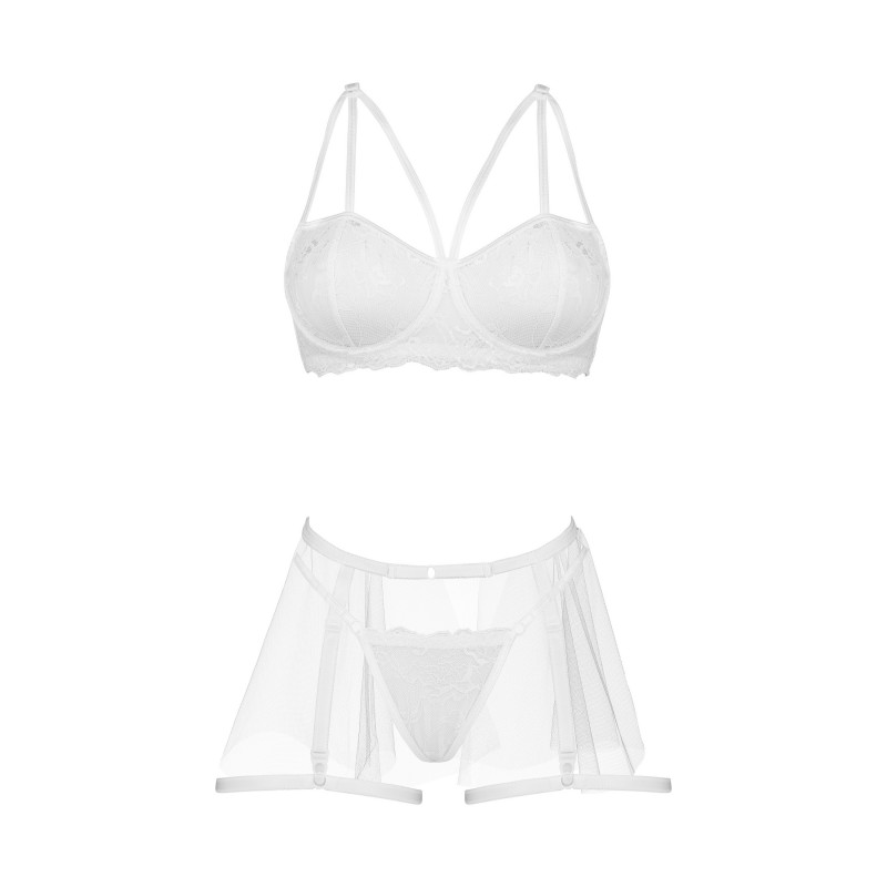 Peony Set White is a delicate lingerie set in a classic white color that captivates with its finesse and elegance. This exceptional set consists of a lace bra, thong, and semi-sheer garter belt.