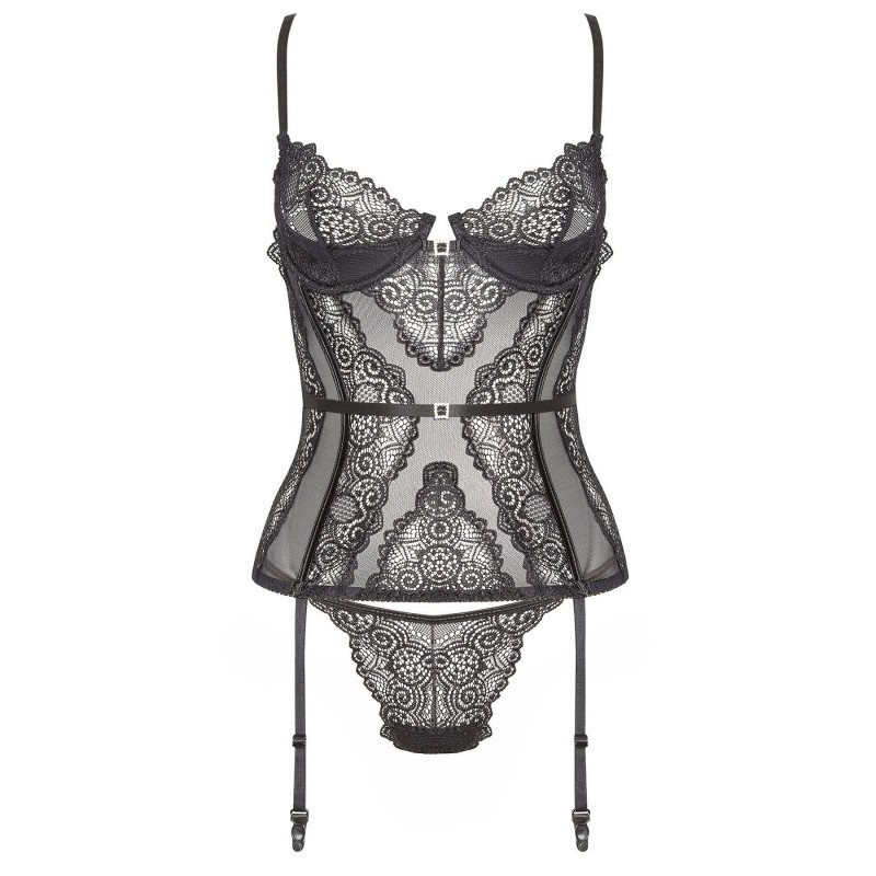 Design: The thong combines perfectly with the bodice, creating a harmonious ensemble. The padded cups provide excellent support and shape for the bust. The back zip allows the bodice to be easily put on and taken off. Delicate lace accentuates feminine curves and adds sensuality.