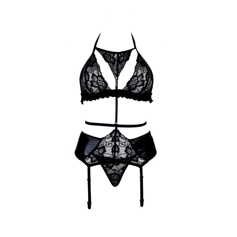 Discover the sensual Alanis Set, designed to accentuate your feminine silhouette and boost your confidence. This unique set consists of a bra, garter belt, and thong, crafted from delicate black lace and shiny material, creating an unparalleled, sexy look. The bra features floral lace that beautifully highlights the bust, while the vertical straps visually slim the body line. Adjustable straps and a back tie ensure a perfect fit and comfort.