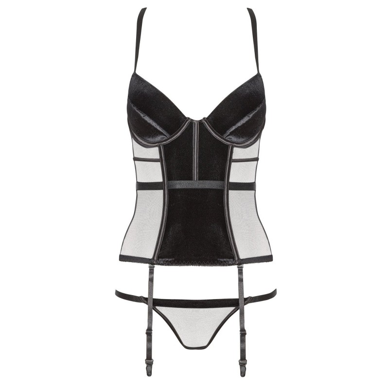 Design: The front of the corset features underwired cups that provide additional support and comfort. The velvet combined with the transparent mesh creates an incredible look. The corset also includes removable garter straps, adding elegance and functionality. Thanks to the removable straps, the corset can also be used as a sexy top for party outfits. The back of the corset captivates with its minimalist design, adjustable straps and hook-and-eye fastening, ensuring a perfect fit. The set also includes a matching thong to complete the look.