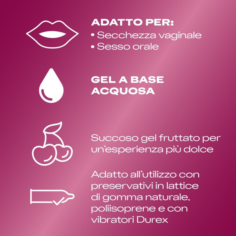 Este lubricante íntimo de Durex permite suavizar la sequedad vaginales. Apto para el uso con condones y con sabor de cereza para experiencias más sabrosas.
