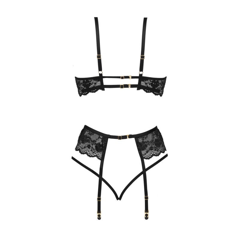 Descubre el sensual Rose Set Black, un exquisito conjunto de lencería que incluye sujetador, tanga y liguero.