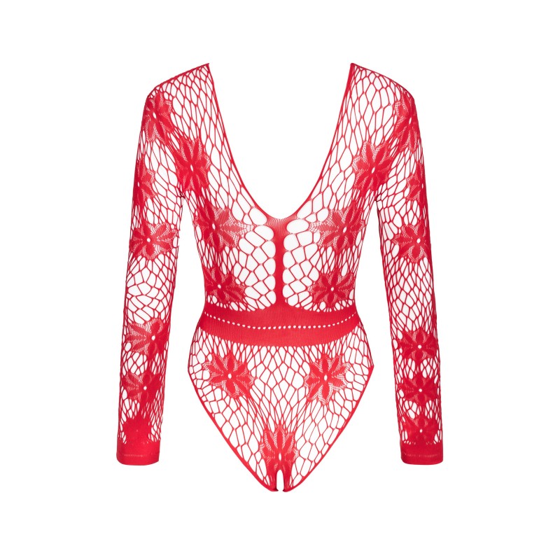 Descubre el sensual encanto del body rojo Regina, que combina elegancia y sex appeal. Confeccionado en malla roja, este body presenta un intrigante estampado floral que le añade un encanto único. Las mangas largas y el escote profundo en la espalda hacen que este modelo sea excepcionalmente seductor y elegante a la vez.
