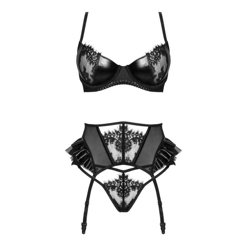 Este impresionante conjunto de lencería combina elegancia con un estilo sensual y atrevido. Confeccionado en tul de encaje negro y tejido wetlook, destaca perfectamente las curvas femeninas, aumentando la confianza. El sujetador con aros y copas de encaje realza hermosamente el busto mientras garantiza comodidad. El liguero alto con delicados volantes resalta la cintura, y las tiras ajustables permiten un ajuste perfecto. El conjunto se completa con un sensual tanga que armoniza con el resto del conjunto.