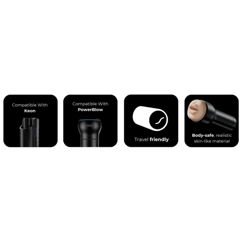 El PowerBlow de Kiiroo encaja perfectamente en el Feel Stroker Mouth para mejorar el práctico masturbador y convertirlo en la máquina de sexo oral definitiva. El accesorio de succión PowerBlow simplemente se atornilla al masturbador. También se adapta a cualquier otro masturbador Stroker de Kiiroo. Los distintos modos de succión pueden controlarse manualmente pulsando un botón directamente en el PowerBlow. También se pueden controlar mediante Bluetooth/Wifi/aplicación para un placer totalmente automatizado e interactivo. A través de la aplicación FeelConnect es posible realizar patrones de sexo oral individuales, jugar a distancia e interactuar con la pareja por control remoto. Los vídeos de realidad virtual se pueden ver a través de FeelMe AI.