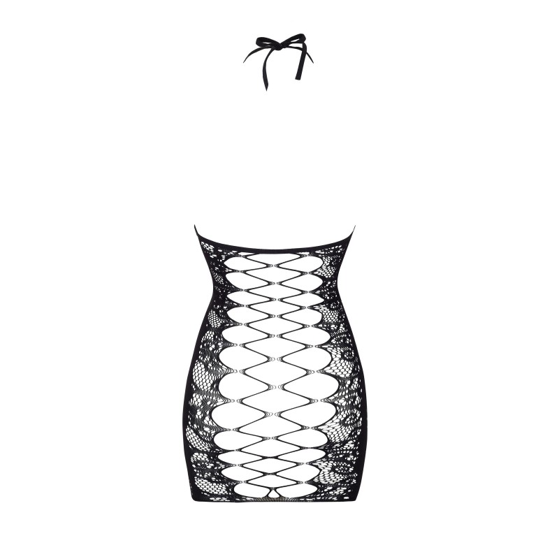 Le devant de la robe est orné d'un motif complexe, créant des effets de transparence étonnants qui ajoutent une touche unique à l'ensemble du look. La partie supérieure de la robe est ornée d'une bordure en dentelle qui met encore plus en valeur le décolleté. Le dos de la robe surprend par un laçage original, qui ajoute une touche d'audace et de sex-appeal à l'ensemble.
