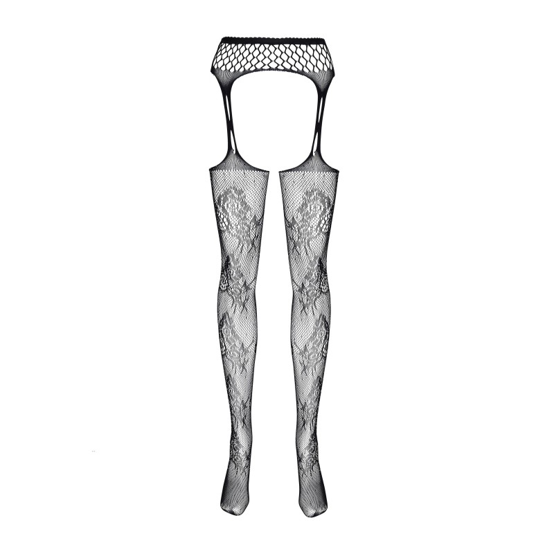 Bas résille noirs combinés à une ceinture. Ils présentent un motif floral sur le devant et le dos et des "cristaux" de différentes tailles sont disséminés sur l'ensemble.