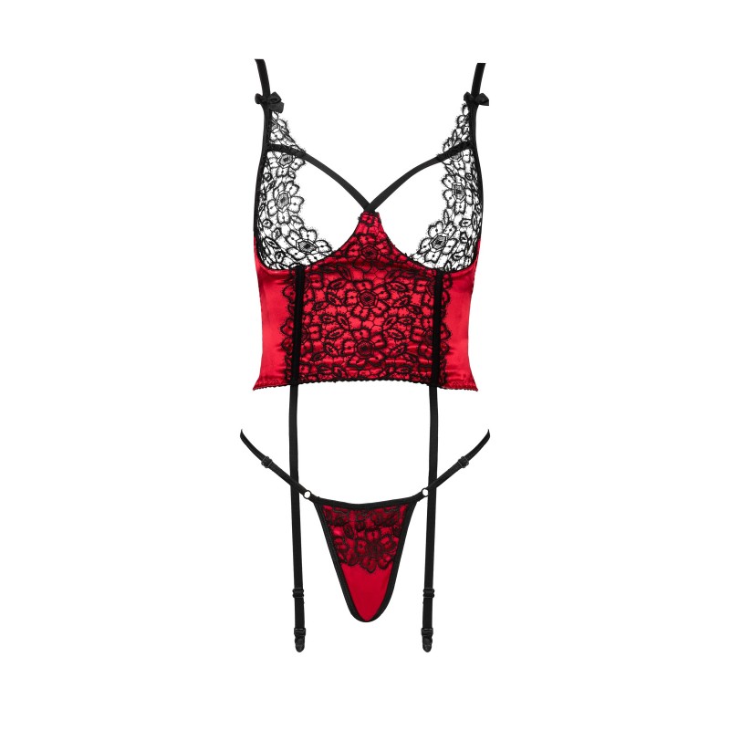 Laissez-vous séduire par le concept d'élégance et de sensualité à son meilleur avec l'ensemble Olena, qui comprend un corset court et un string en luxueux satin rouge et guipure noire.