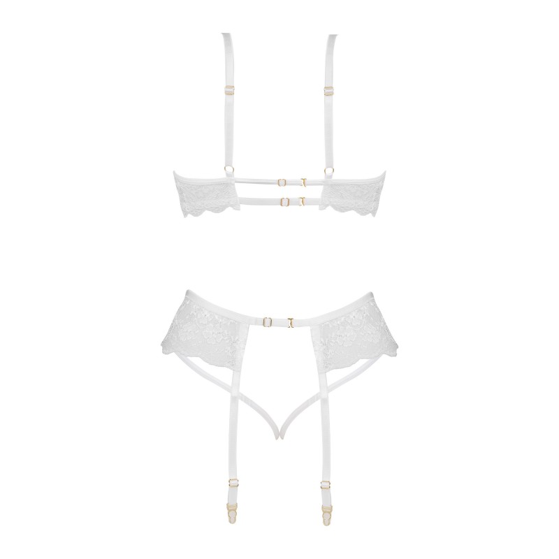Voici l'ensemble de lingerie blanche sensuelle Rose set, qui comprend un soutien-gorge, un string et un porte-jarretelles.