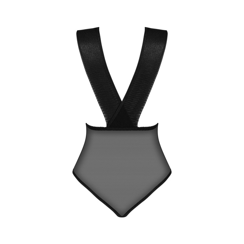 Un magnifique body classique d'un noir profond, fait de dentelle et de tulle chatoyant. Le décolleté profond et les épaisses bretelles croisées dans le dos ajoutent à la sophistication.