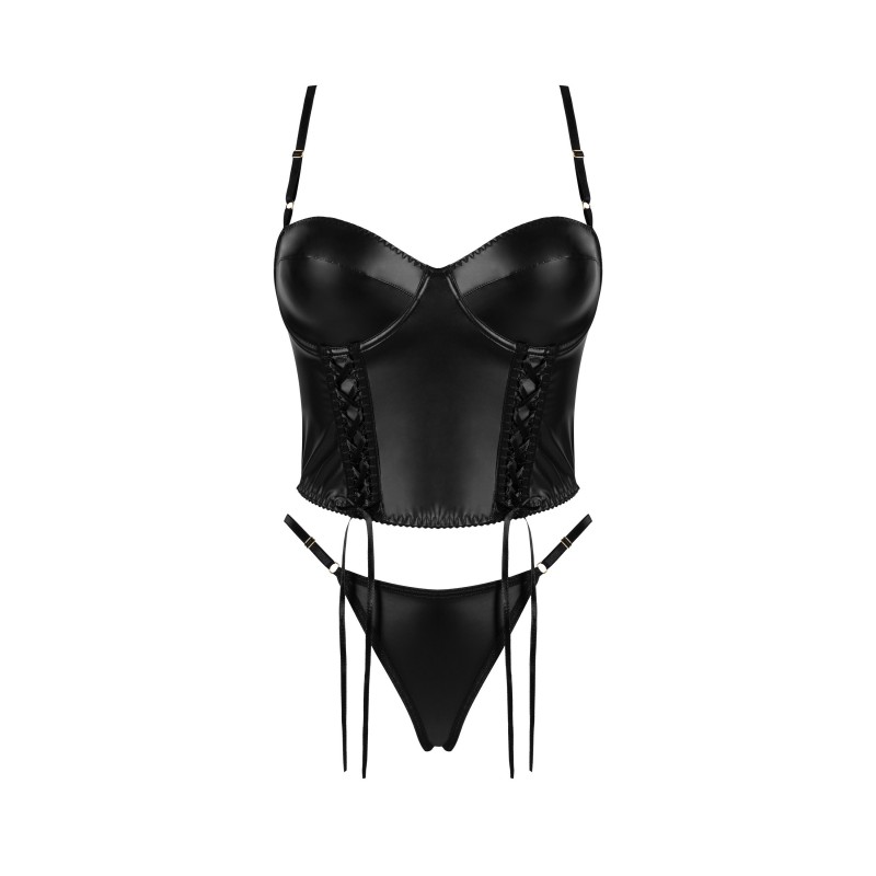 Un ensemble sexy en éco-cuir noir, parfait pour les femmes qui veulent mettre en valeur leur assurance et leur style unique. Le top court - corset avec bonnets à armatures assure un excellent soutien du buste, et le laçage décoratif sur le devant ajoute une touche de fougue à l'ensemble.