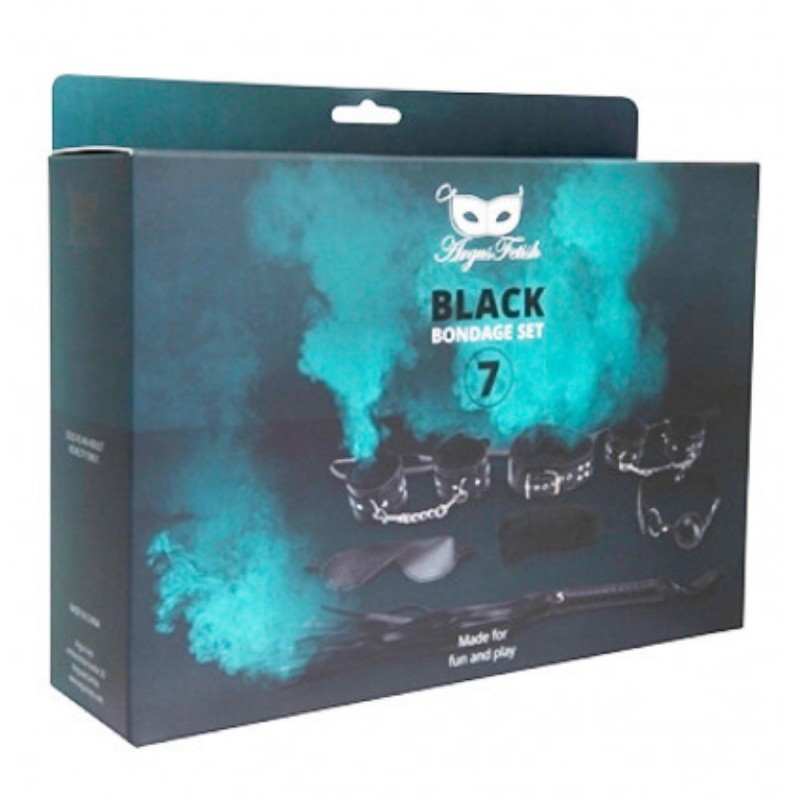 Contém: algemas para os pulsos, algemas para tornozelos, venda para os olhos, mordaça, chicote, coleira e trela de 5 metros.