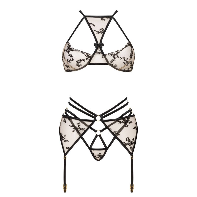 Conjunto exclusivo e extremamente sexy composto por sutiã, cinto de ligas e tanga. Este conjunto excecional, confeccionado em tule nude e adornado com um padrão floral preto, irá acentuar a sua beleza natural e fazê-la sentir-se sensual e luxuosa.